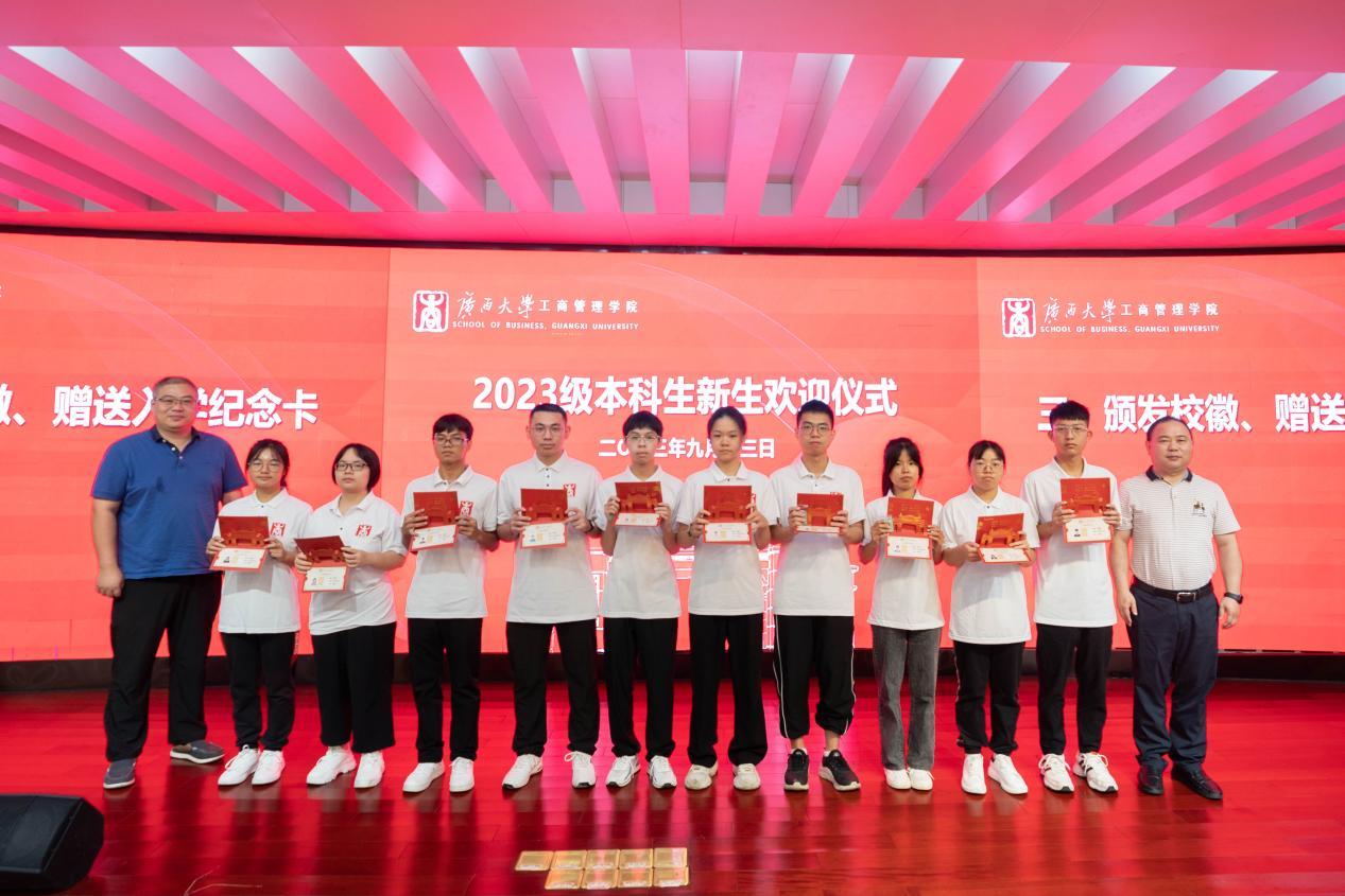 在热烈的掌声中,院领导、老师为新生代表赠送校徽、入学纪念卡,祝贺他们成为了光荣的“西大人”。2023年,学院特别为每一位新生订制了精美的“遇见西商”入学纪念卡。每张纪念卡上记录着新生的姓名、专业、学号以及一张入学时的照片,为新生留下深刻美好的入学回忆