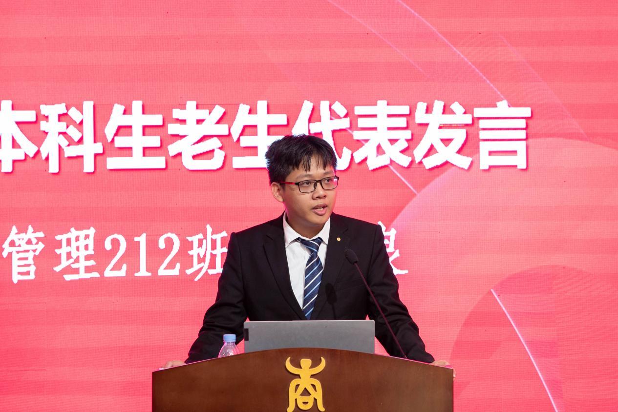 2021级工商管理学硕翟艳洁、财务管理212班吴谨良作为老生代表发言。翟艳洁建议新生们明确目标,矢志奋斗;笃实好学,刻苦钻研;精进不休,博闻强识。吴谨良希望大家立身以立学为先,立学以读书为本,尽快制定适合自己的学业规划和人生目标,不断学习,提升综合素质。