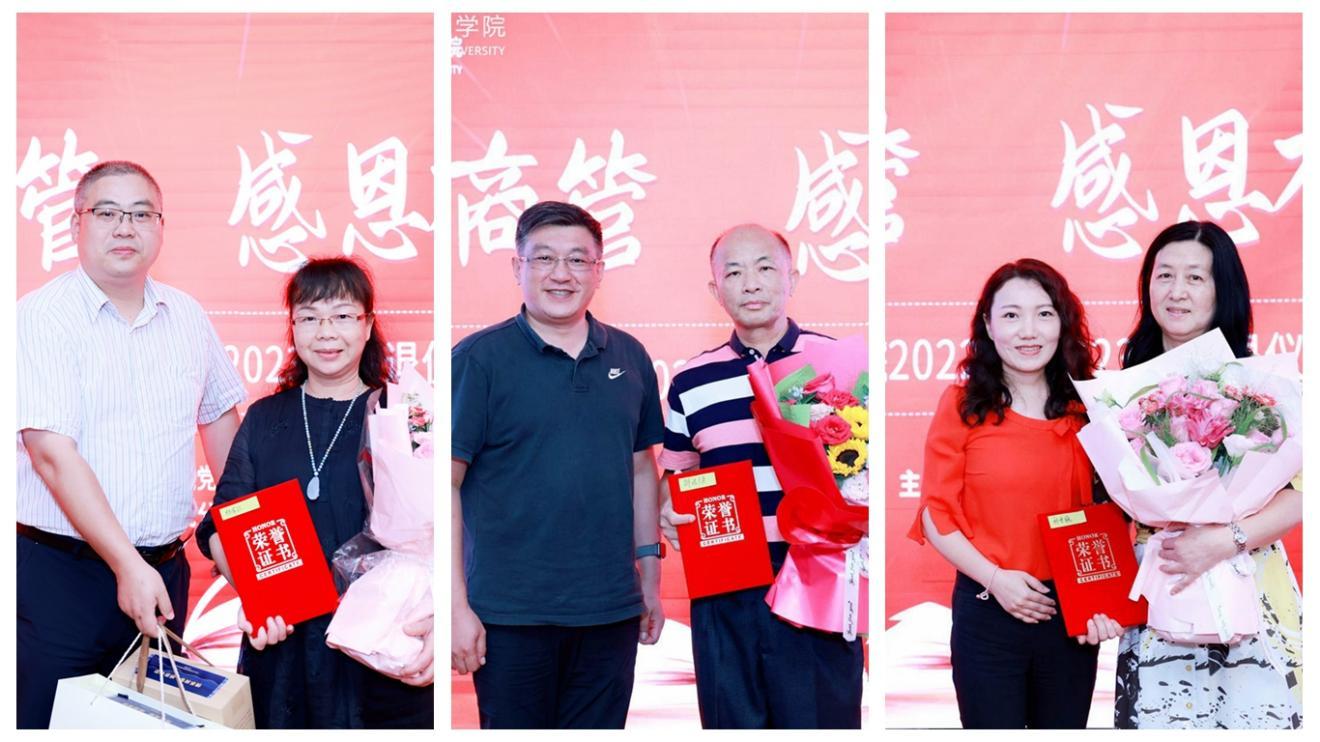 学院领导分别为退休老师们颁发荣退证书、纪念品和鲜花