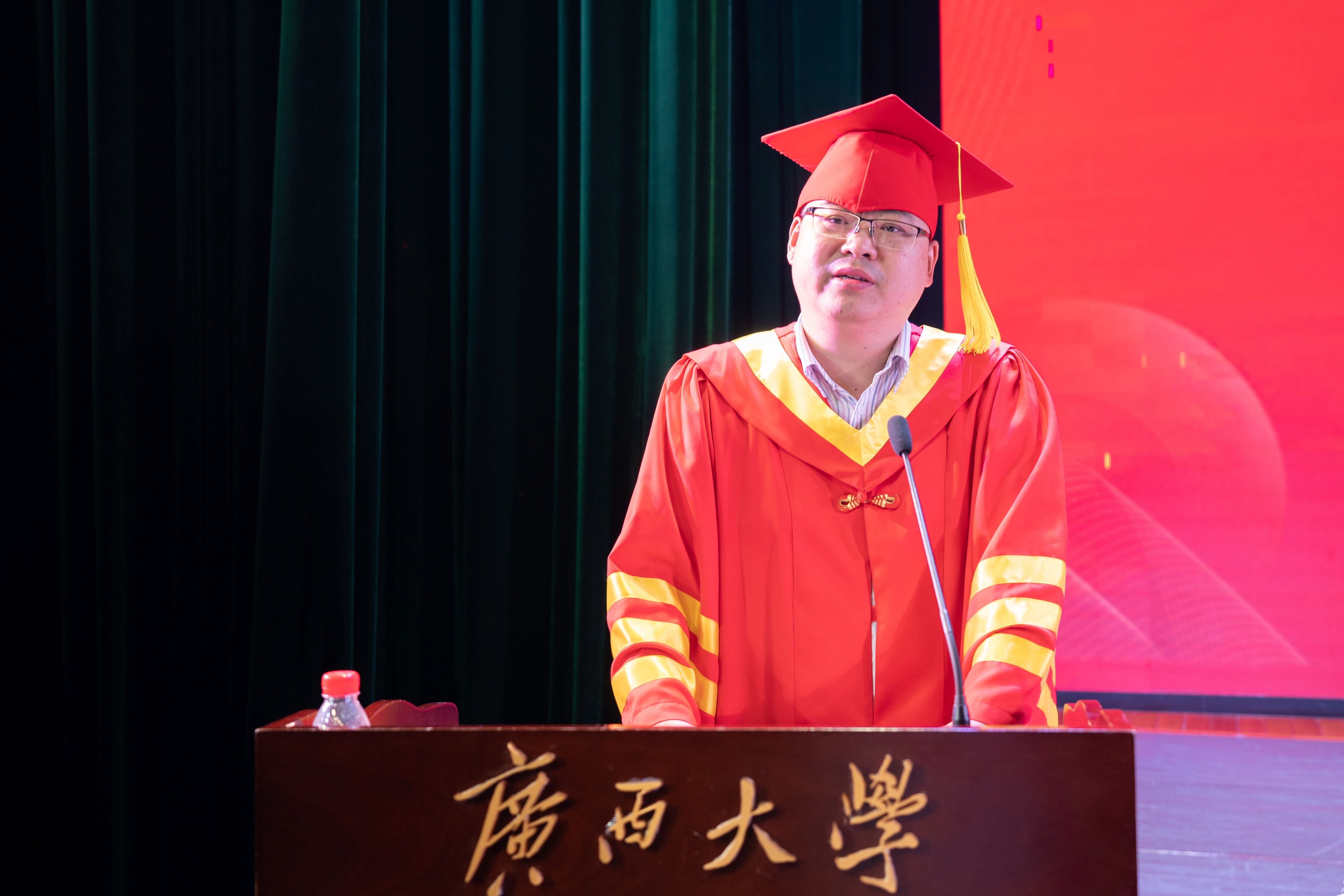 会计与财务金融系覃朝勇教授作为教师代表发表了感人至深的讲话。他首先寄语毕业生们要坚守初心,无论未来遇到怎样的困难和挑战,都要保持对知识和真理的追求和热爱。要勇于创新,敢于挑战,不断探索新的领域和新的可能性,为实现梦想和追求而不懈努力。同时,要担起时代责任,为社会发展贡献力量,着力把青春华章写在祖国大地上。
