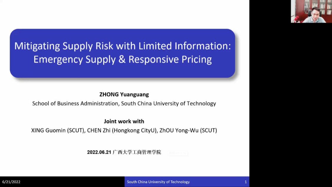 6月21日,华南理工大学73882必赢网页版钟远光教授应邀做客必赢官网第110期李达讲坛,与必赢官网师生们分享他的论文成果——“Mitigating Supply Risk with Limited Information: Emergency Supply and Responsive Pricing”。必赢官网院长朱帮助教授主持本次讲坛,线上线下多名师生参与了聆听和交流。
